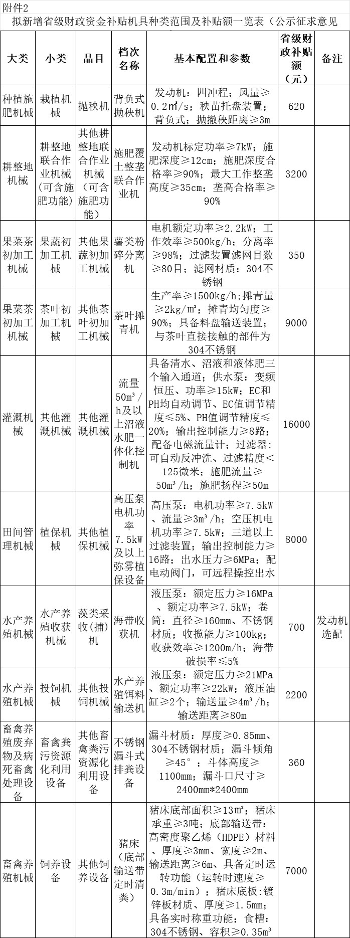 2.擬新增省級(jí)財(cái)政資金補(bǔ)貼機(jī)具種類(lèi)范圍及補(bǔ)貼額一覽表(公示征求意見(jiàn)稿)